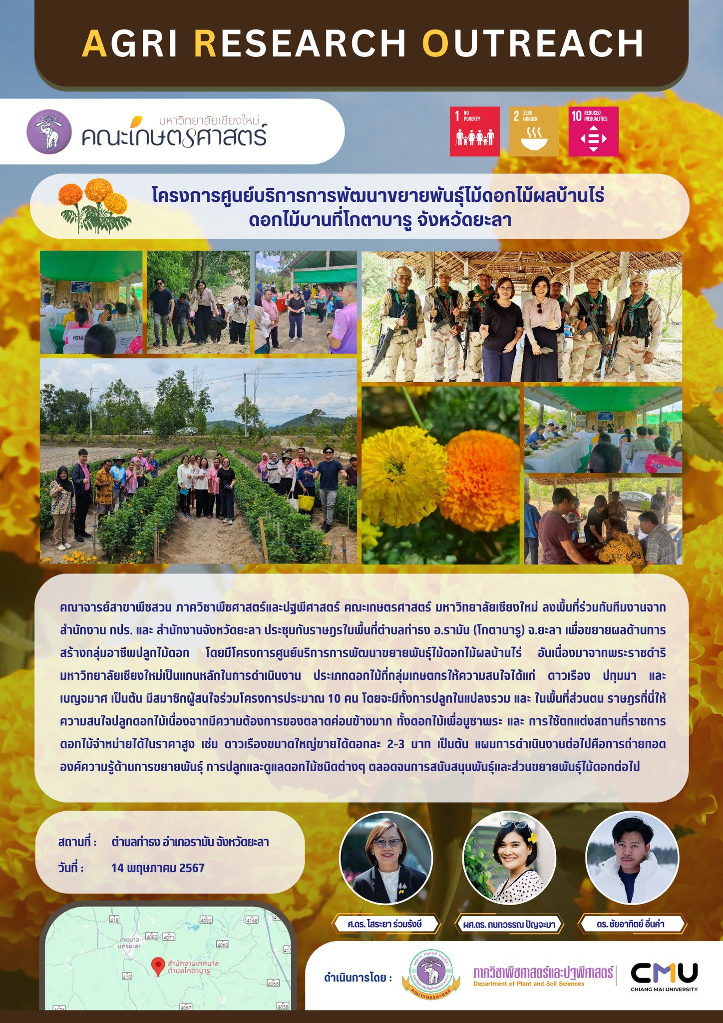 คณาจารย์สาขาพืชสวน ภาควิชาพืชศาสตร์และปฐพีศาสตร์ คณะเกษตรศาสตร์ มหาวิทยาลัยเชียงใหม่ ลงพื้นที่ร่วมกับทีมงานจากสำนักงาน กปร. และ สำนักงานจังหวัดยะลา ประชุมกับราษฎรในพื้นที่ตำบลท่าธง อ.รามัน (โกตาบารู) จ.ยะลา เพื่อขยายผลด้านการสร้างกลุ่มอาชีพปลูกไม้ดอก โดยมีโครงการศูนย์บริการการพัฒนาขยายพันธุ์ไม้ดอกไม้ผลบ้านไร่
